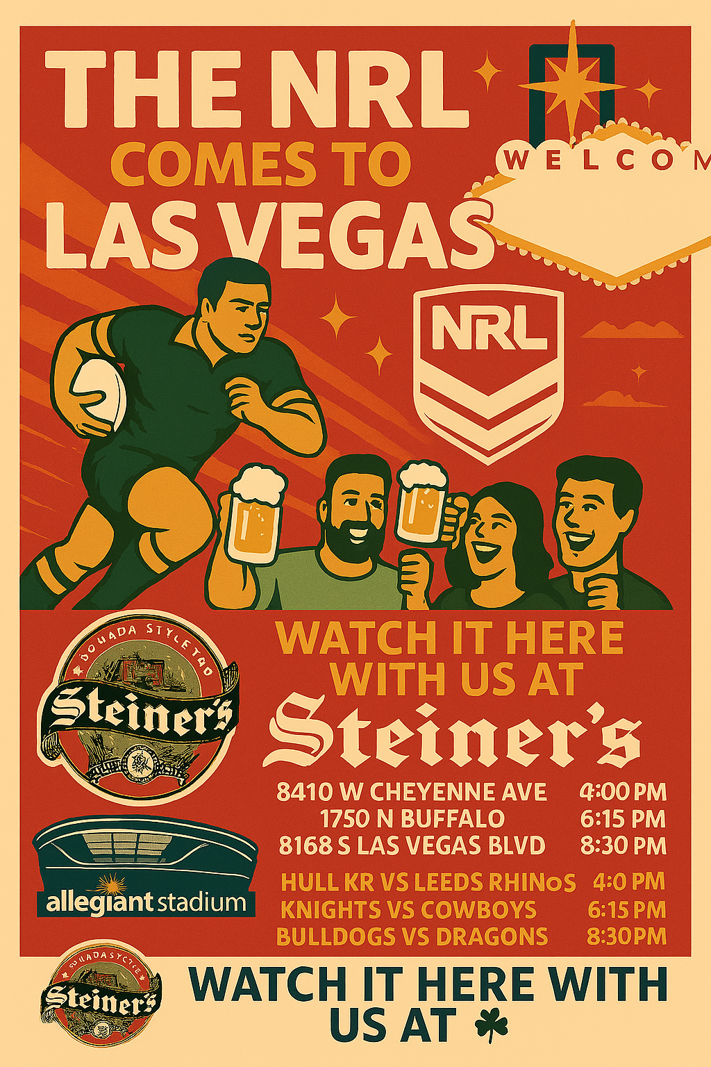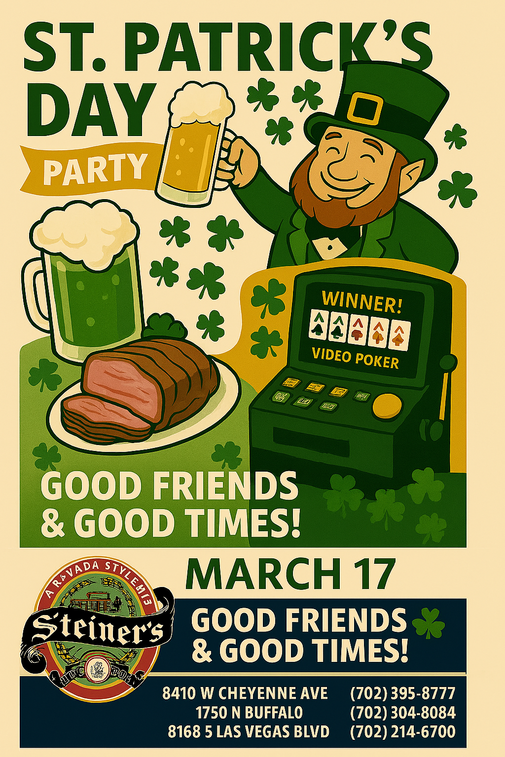 Steiner’s, A Nevada Style Pub, is a three-unit gaming restaurant and bar that offers an extensive menu, a wide selection of top-notch beer and liquors, a multitude of gaming promotions and special events, and authentic décor and memorabilia that encapsulates the history of Nevada.