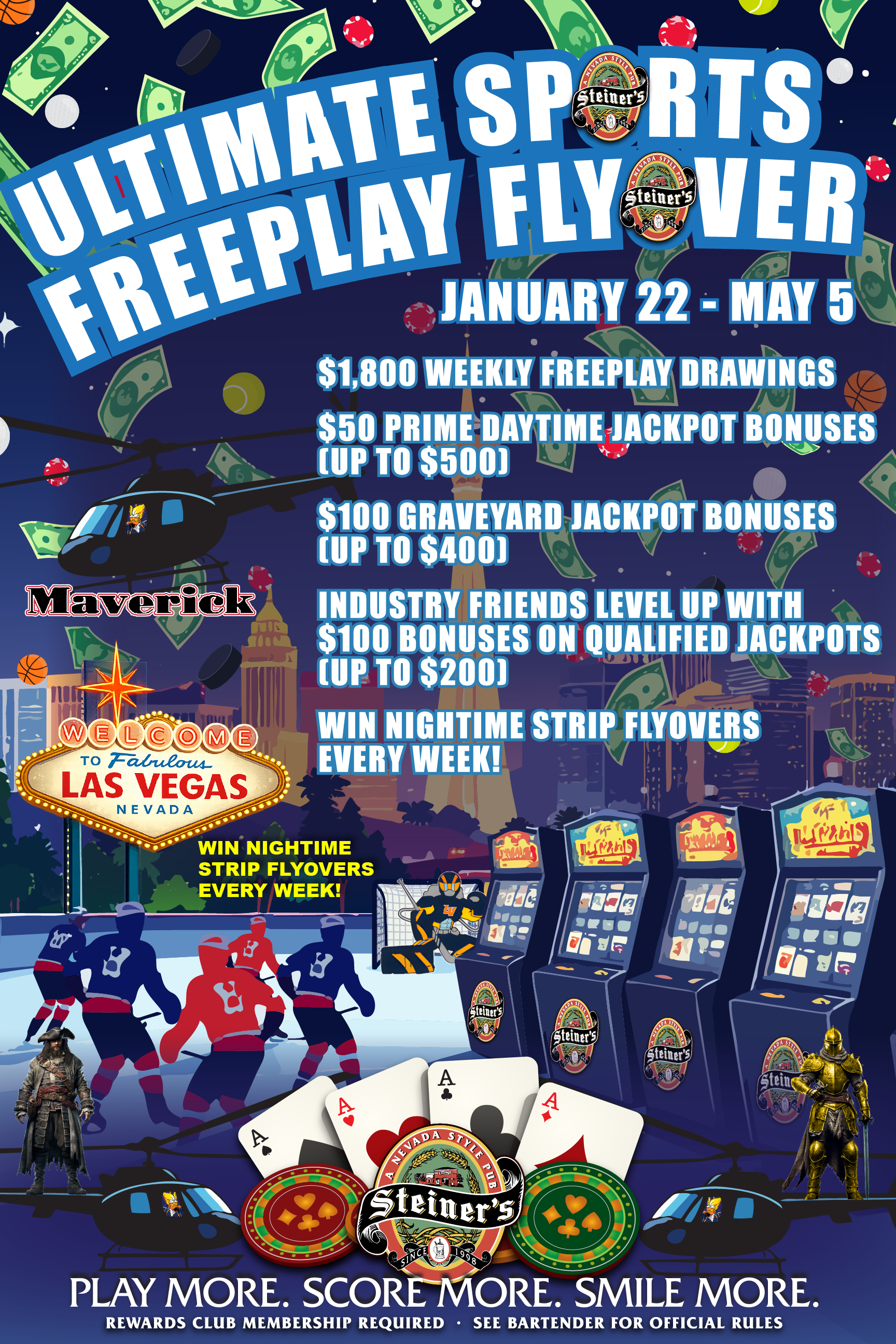 Steiner’s, A Nevada Style Pub, is a three-unit gaming restaurant and bar that offers an extensive menu, a wide selection of top-notch beer and liquors, a multitude of gaming promotions and special events, and authentic décor and memorabilia that encapsulates the history of Nevada.